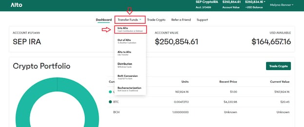 - Log in to your Alto investor account and navigate to the Transfer Funds section at the top of your dashboard.