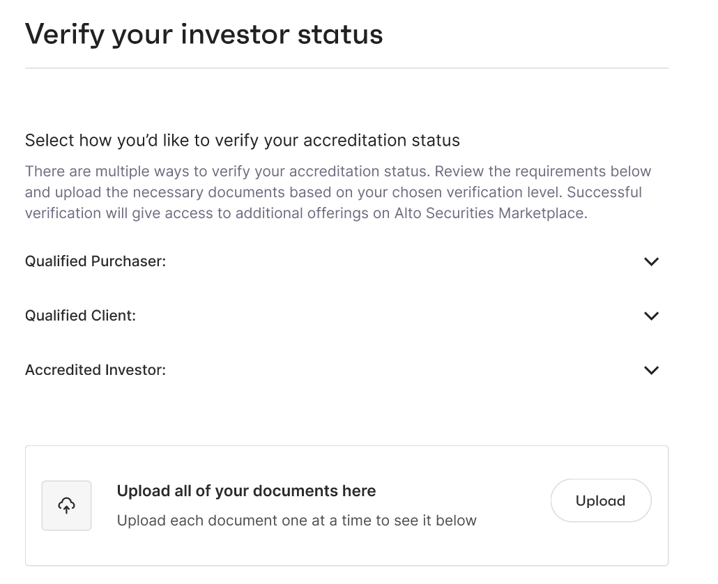 Accreditation helps get you ready to invest when you find a deal you love, and Alto’s process makes it simple. Our self-accreditation tool takes just minutes to complete.