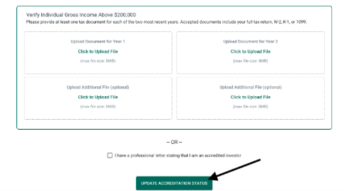 Note: You will need to upload documentation to verify your accreditation status for whichever option you select.