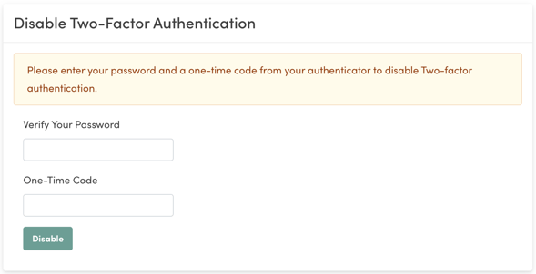 Step 4: Click Disable Two-Factor Authentication and enter your password and one-time code from your chosen 2FA application.