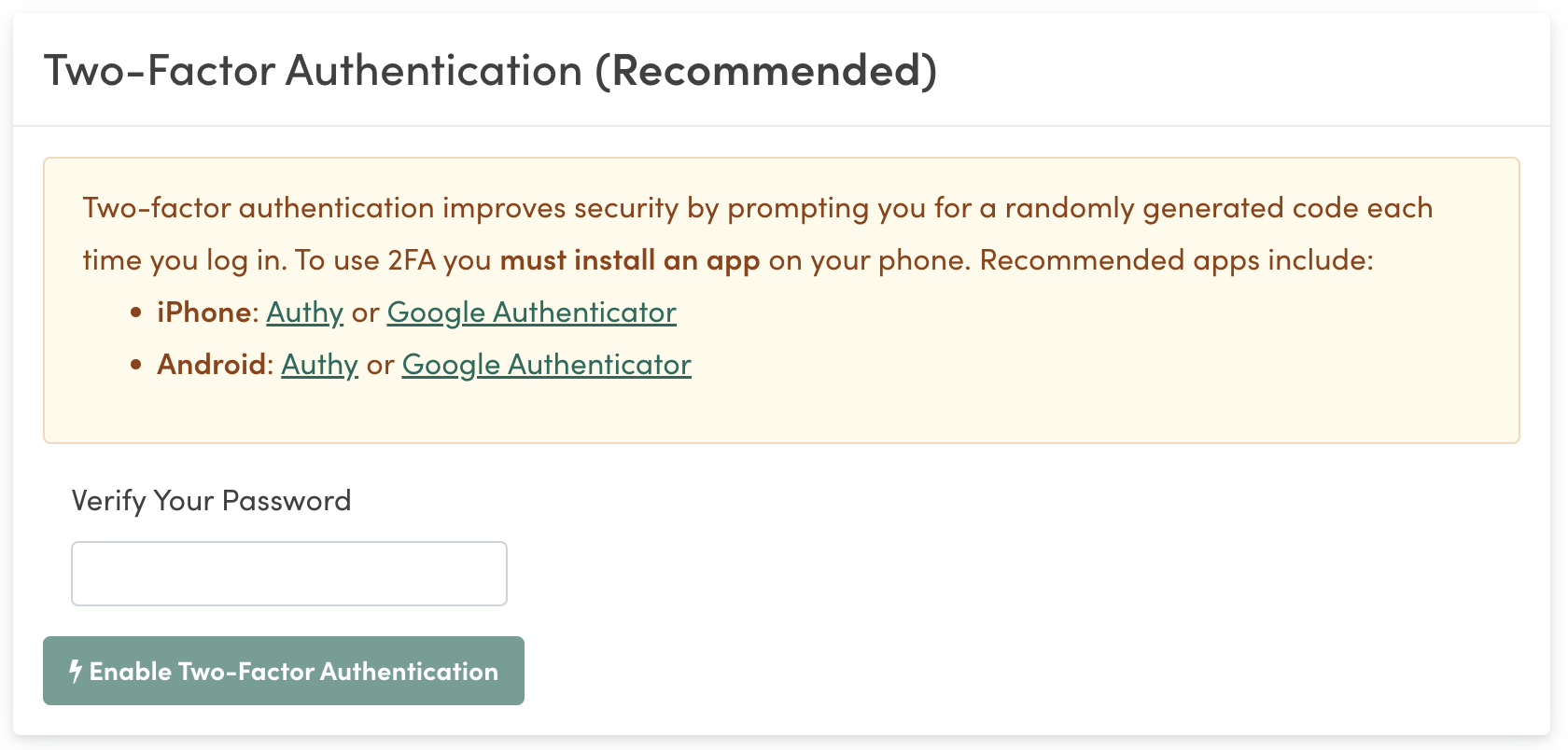 Step 4: Enter your password and click the green Enable Two-Factor Authentication. A QR code will appear for you to connect your Alto account to your chosen 2FA application.