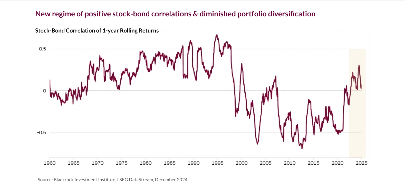 Blended earnings and coupon yields for a traditional 60/40 portfolio sit near historic lows, suggesting forward returns may be below long-term averages. At the same time, the negative correlation between stocks and bonds that supported diversification for much of the past three decades has weakened in a more inflationary environment.