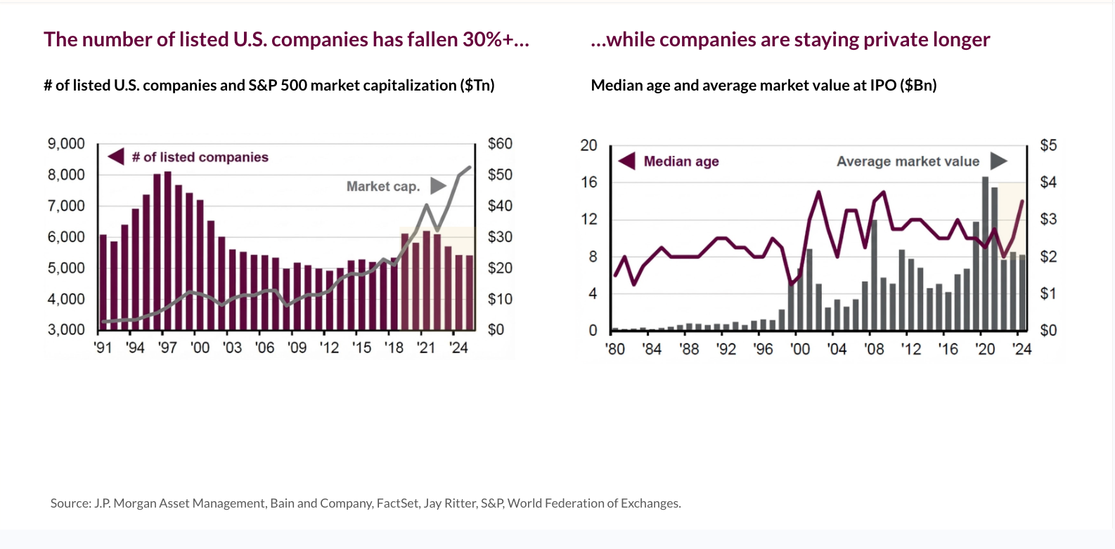 Private markets expand the investable universe. Today, most scaled US businesses with more than 100 million dollars in revenue are private, and are remaining private longer. A meaningful portion of value creation now occurs before a public listing. For allocators, that shift influences where and how growth exposure is sourced.