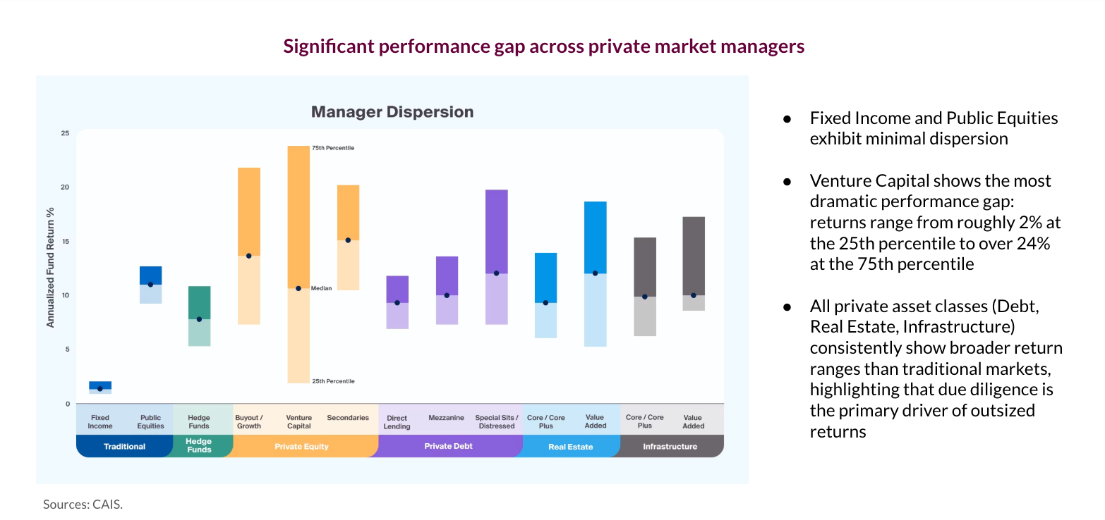 In public markets, performance differences between managers tend to be relatively narrow. In private markets, the gap between top and bottom quartile funds can be wide. That dispersion shifts attention from broad market exposure to manager selection.