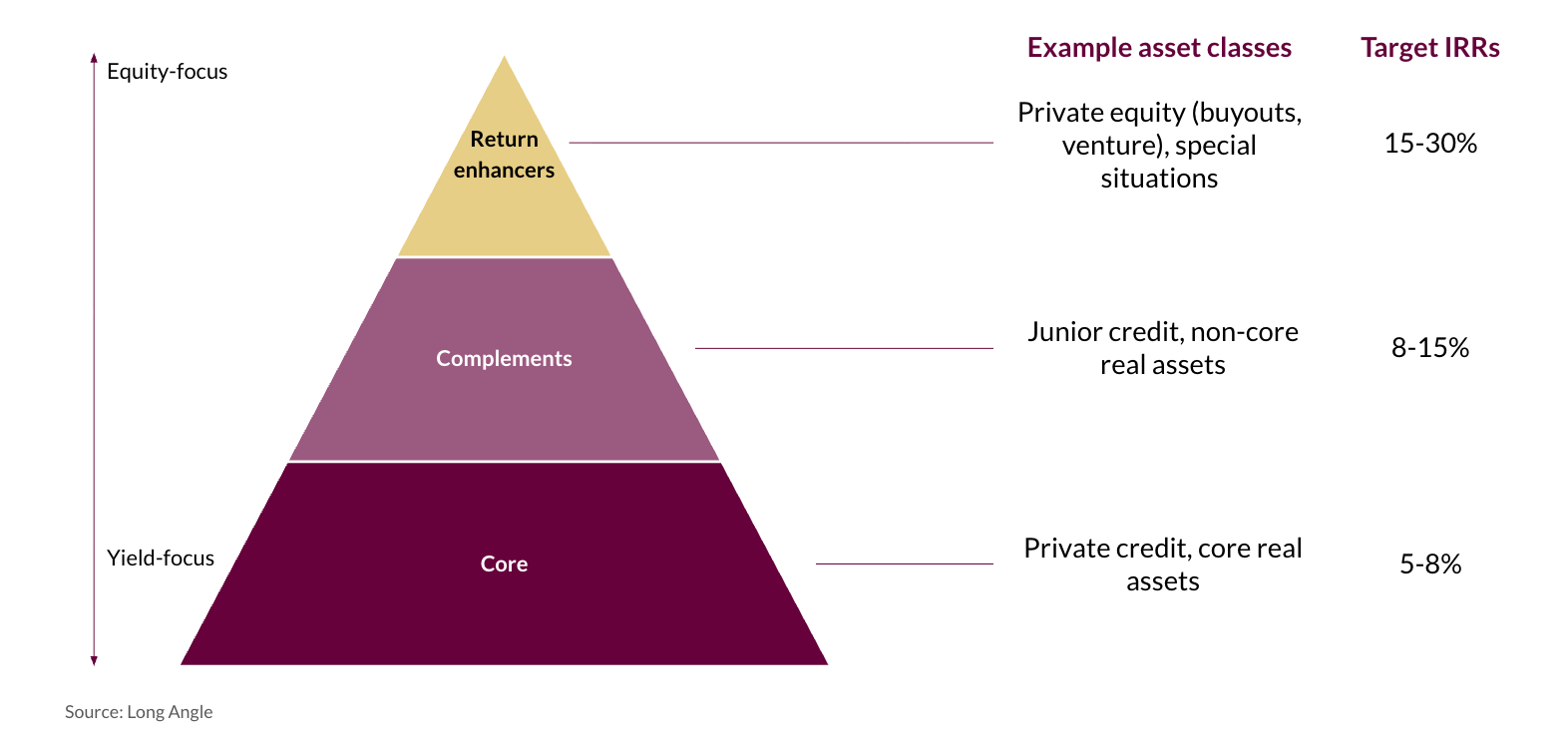 During the webinar series, Long Angle’s Min Park discussed a framework that organizes private strategies by their role within a portfolio. Income-oriented exposures such as private credit and core real assets may provide stability and predictable yield. Complementary strategies have historically targeted mid-teens returns with moderate risk. Equity-focused strategies, including buyouts and venture capital, pursue higher return potential alongside greater variability in outcomes.