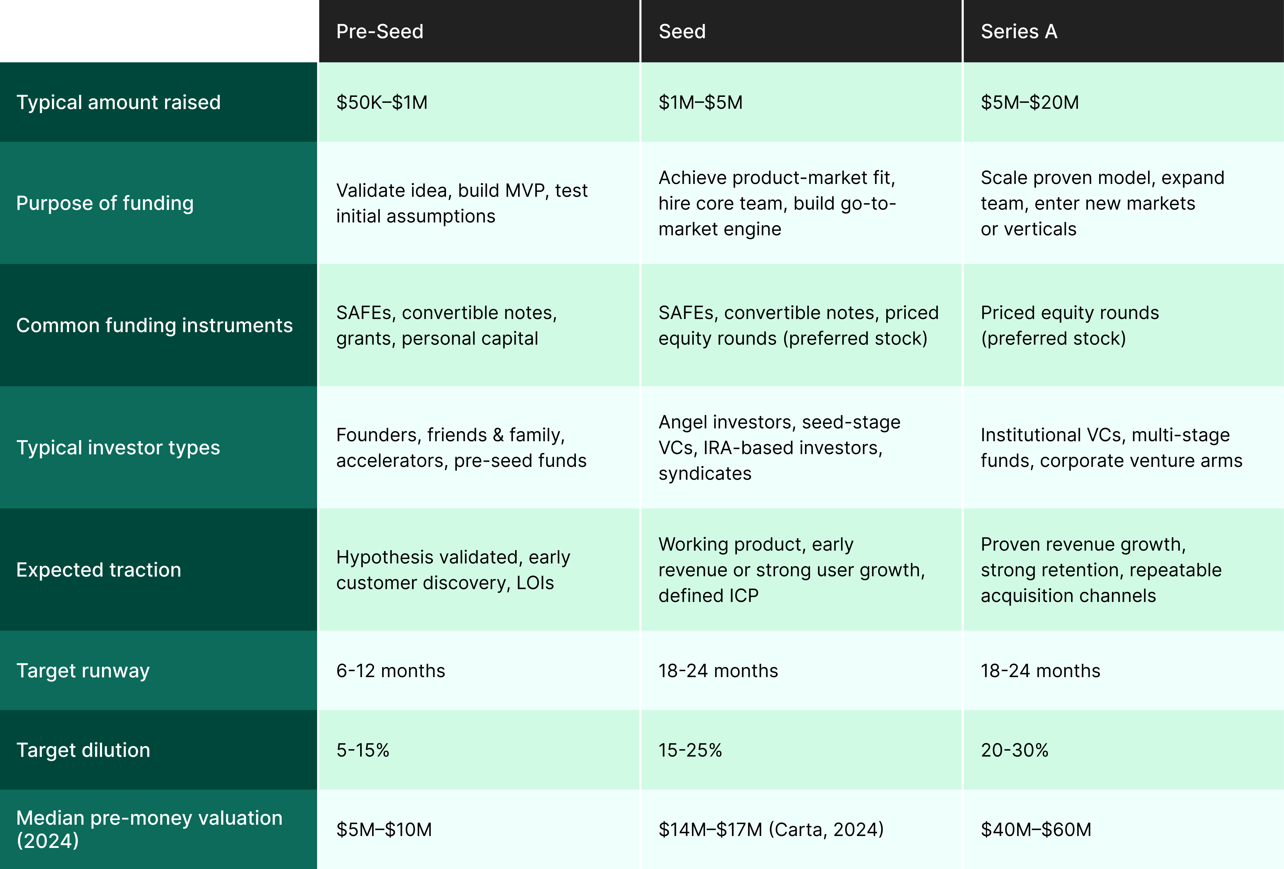 Understanding where seed fits in the broader lifecycle is essential for structuring a raise that matches your company's actual growth stage. Here's how pre-seed, seed and Series A rounds typically compare: