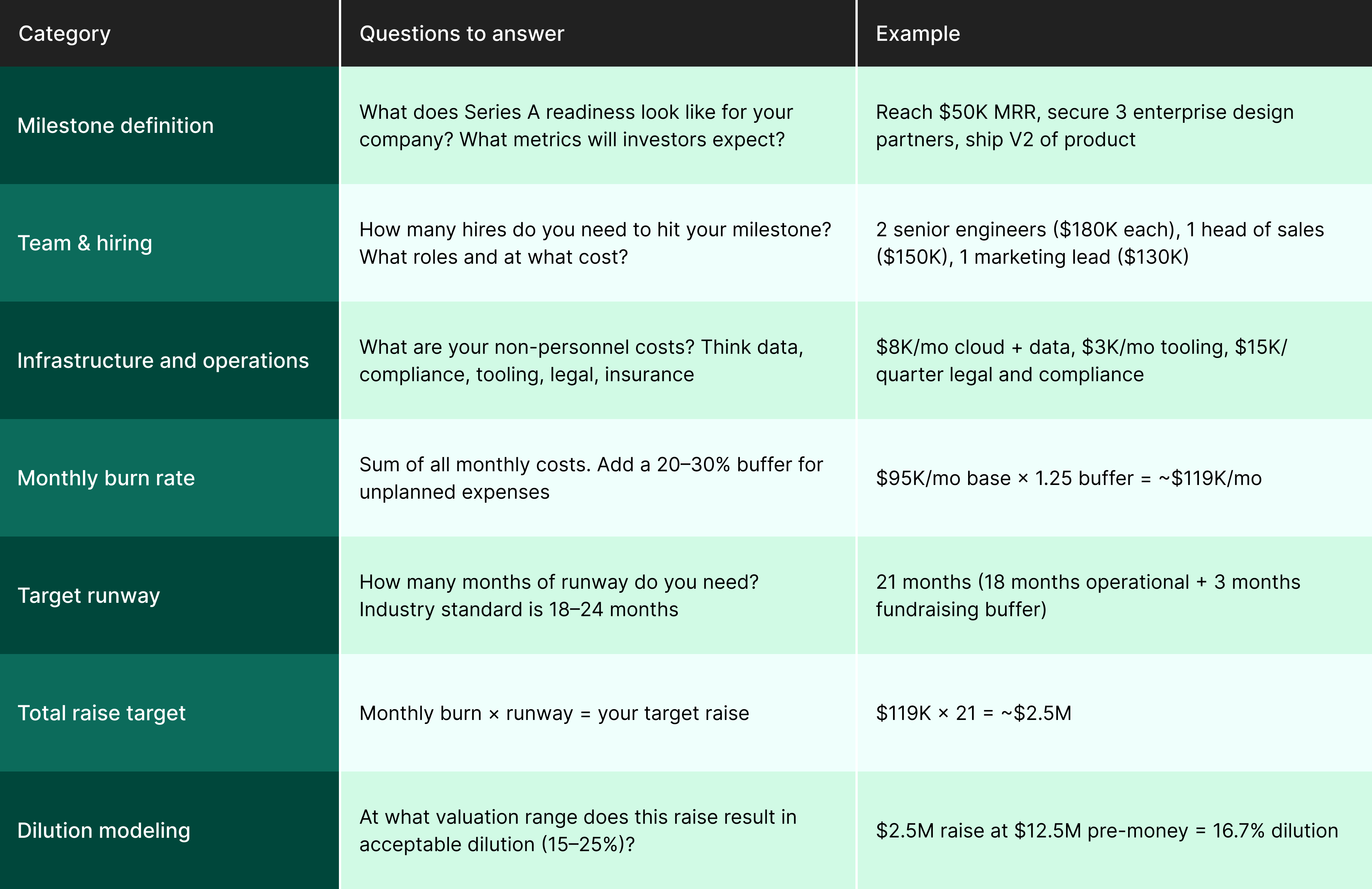 Instead, start with the milestone you need to hit, then work backwards. Figure out the team, infrastructure and timeline it takes to get there, and build your raise target from there. This also forces you to think clearly about dilution, or the reduction in your ownership percentage as new shares are issued. The more you raise, the more equity you give up and the smaller your stake becomes. Keep in mind that the valuation you set now shapes your leverage at the Series A stage.