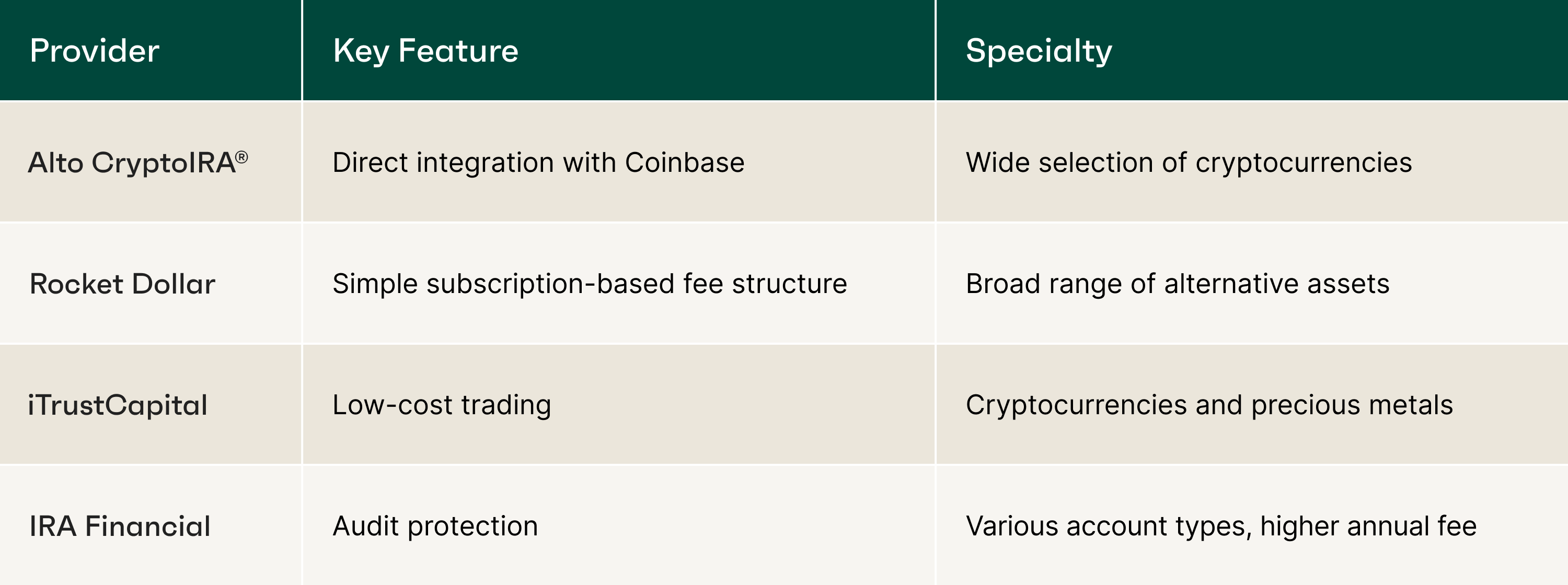 In 2025, a growing number of self-directed IRA custodians cater specifically to crypto investors. Prominent names in the space include Alto CryptoIRA®, Rocket Dollar, iTrustCapital and IRA Financial. Each of these providers offers unique features and a distinct fee structure, making it essential for investors to compare them carefully before committing.