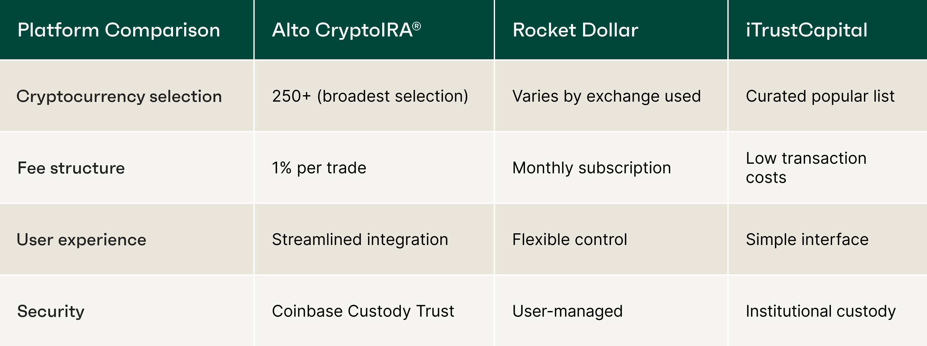 When comparing Alto CryptoIRA® to other platforms, investors will notice different models. For instance, Rocket Dollar uses a subscription model with a one-time setup fee and a flat monthly charge. iTrustCapital, on the other hand, focuses on low transaction costs for a curated list of popular cryptocurrencies.