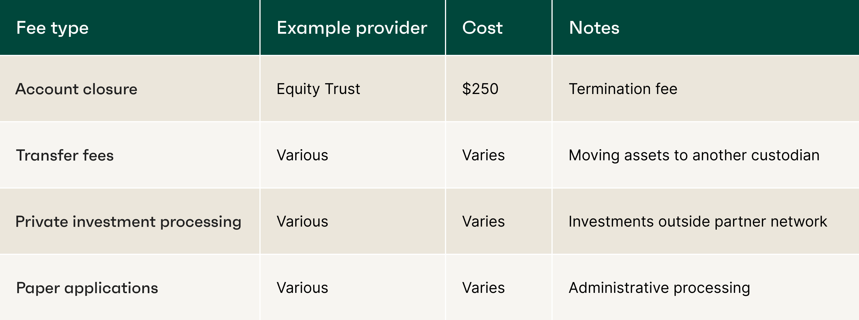 For instance, investors using a checkbook control IRA may be responsible for network fees (or "gas fees") when moving crypto between wallets. Some platforms may also have different fee tiers for trading certain types of alternative assets or charge extra for specialized custody solutions required for less common tokens.