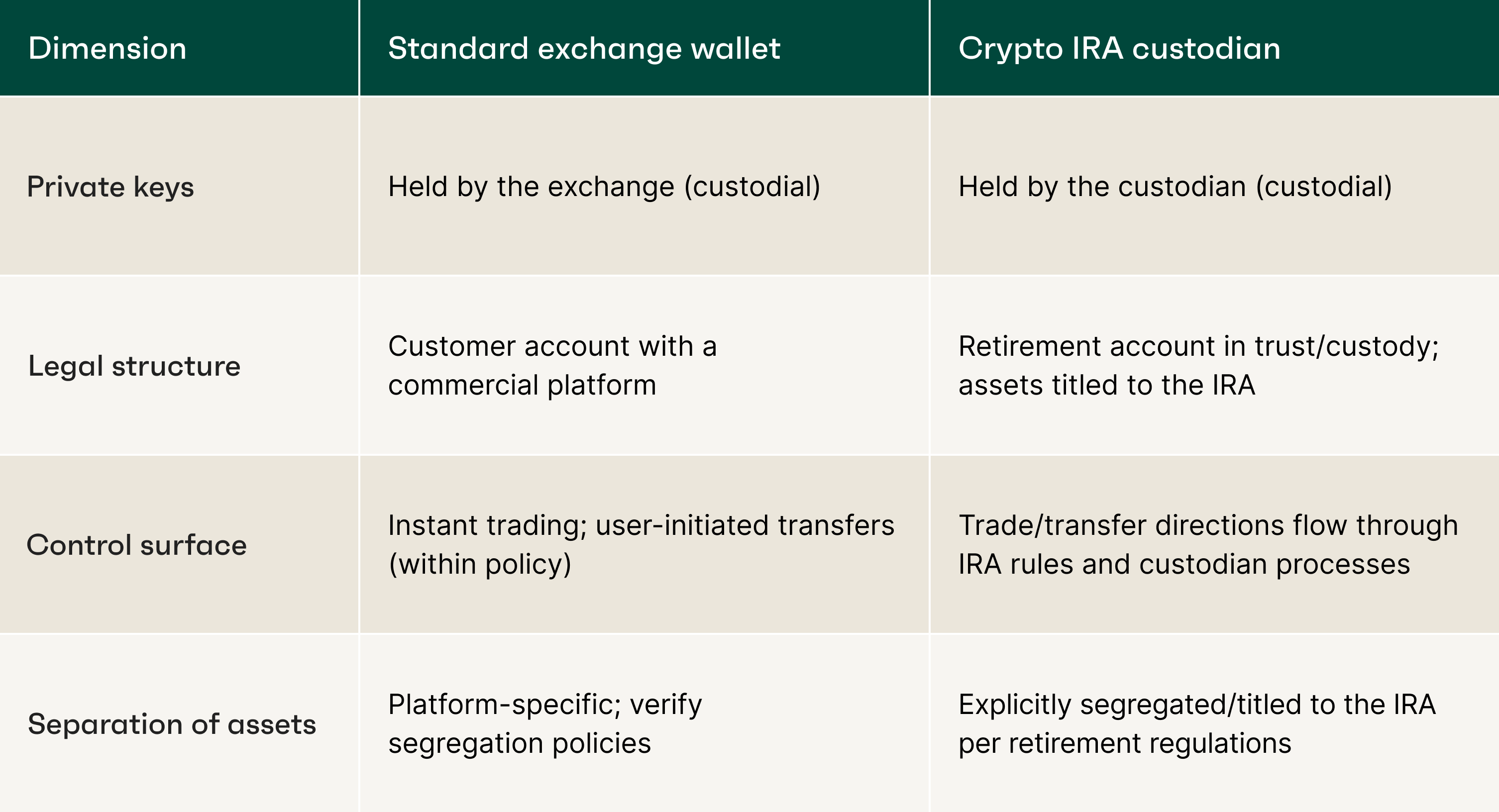 Takeaway: Both models are custodial, but a crypto IRA wraps legal ownership in a retirement trust/custody structure, whereas an exchange account is a commercial service relationship. That legal wrapper matters for asset segregation, reporting and beneficiary planning.